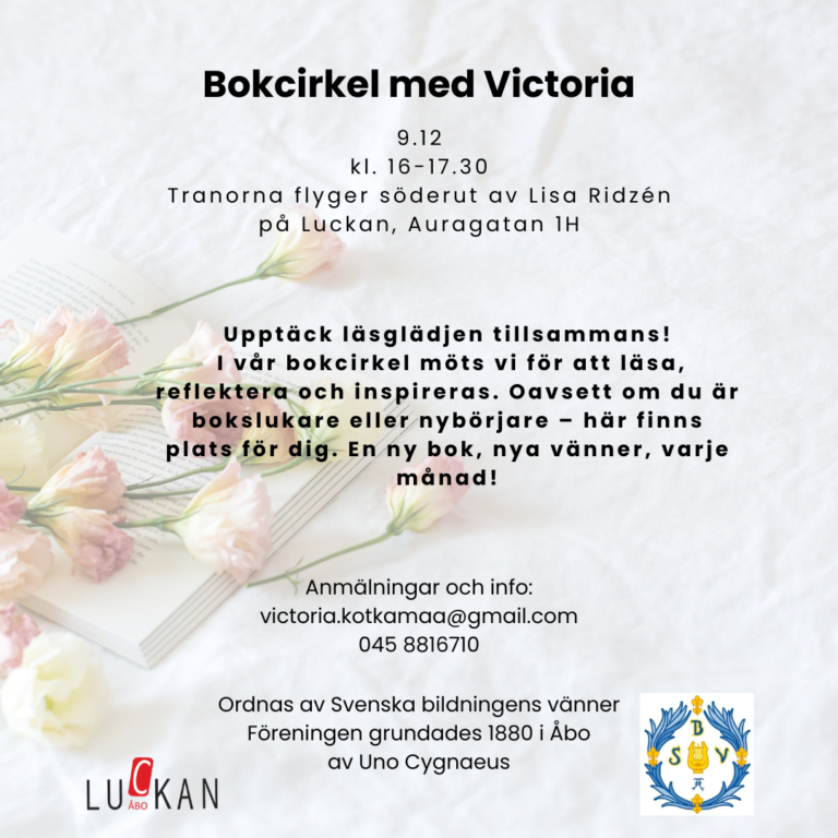 Tyvärr måste Svenska bildningens vänner ställa in bokcirkeln imorgon. Gruppen fortsätter med sina träffar i januari! Ha sköna vinterlässtunder!