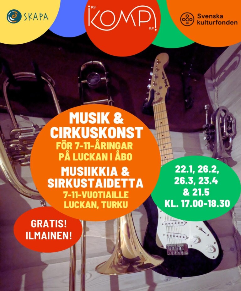 Nu startar vårens musik- och cirkusverkstäder med KOMP! Välkomna alla 7–11-åringar i Åbotrakten! Vi träffas torsdagarna; 22.1, 26.2, 26.3, 23 och 21.5 kl. 17:00-18:30 Är du redo för roliga och spännande äventyr?Hos KOMP! får du prova på musik och cirkus i en inspirerande och lekfull miljö. En eftermiddag fylld av kreativitet, skratt och nya upptäckter väntar…