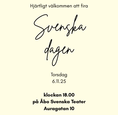 Torsdag 6.11 kl. 18 på Åbo Svenska Teater, Auragatan 10 Årets festtalare är Timo Ketonen, styrelseordförande för TS-Yhtymä.I programmet medverkar också bl.a.Åbos borgmästare Piia Elo, skådespelarenSamuel Karlsson, en grupp från showkörenÅK Ensemble samt sångaren Sofia Finnilä och band medmusik av Lasse Mårtenson. Konferencier är Maria Olin, projektchef för Levande tvåspråkighet i Åbo. Notera att du…
