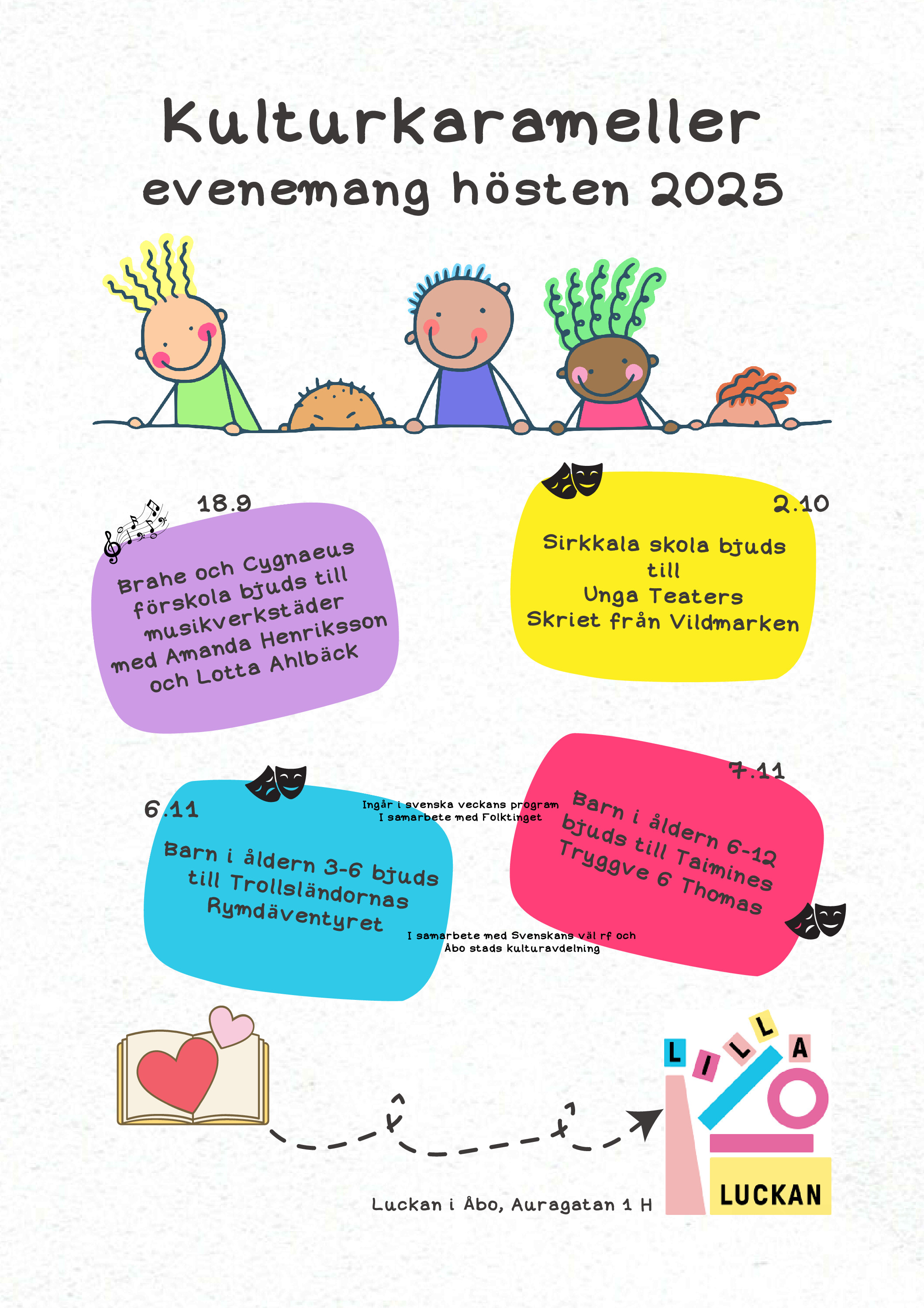 Luckan Barnkultur är tillbaka med nya program för våren 2025, det finns något för såväl små som stora. Här ser du en del av det vi ordnar, mera på kommande!