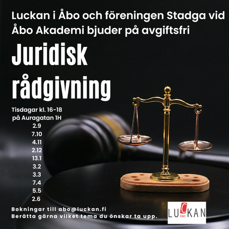 Luckan i Åbo tillsammans med juridikföreningen Stadga erbjuder gratis juridisk rådgivning! Nästa träff tisdagen 7.10 kl. 16-18 på Auragatan 1H. Boka din halvtimme till [email protected] eller 044 9023000. Välkommen!