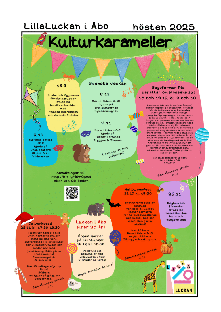 Halloweenfest! 31.10 kl. 18-20 för barn i åldern 9-12, avgift: 2€/barn Julverkstad! 25.11 kl. 17.30-19.30 för barn i åk 1-6, avgift: 2€/barn Sagofarmor Pia och Mössens jul, 15.12 och 19.12 kl. 9 och kl. 10, för barn i åldern 5-8 Luckan i Åbo firar 25 år! Vi vill bjuda alla barnfamiljer att besöka LillaLuckan den…