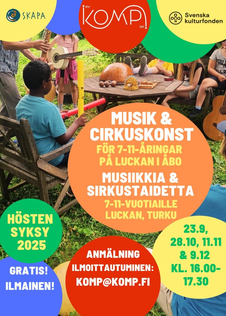 Musik- och cirkuskonst i Åbo för 7-11-åringar! Hösten 2025 erbjuder Komp! spännande verkstäder där barn och unga får upptäcka cirkuskonster och skapa musik! Välkommen att vara en del av en konst- och kulturresa fylld med gemenskap, inspiration, kreativitet och framför allt – roliga stunder! Våra verkstäder är öppna för både svenska, finska och engelskspråkiga barn…