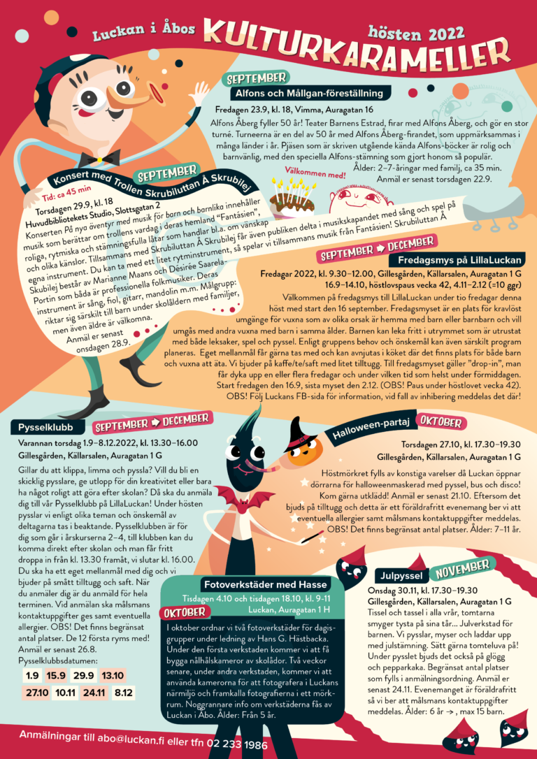 Här hittar du årets Kul på fritiden-broschyr i elektronisk form! Broschyren har producerats av Luckan i Åbo för femtonde året i rad och innehåller information om fritidssysselsättningar på svenska för barn och unga i Åbotrakten. Broschyren delas ut till alla svenskspråkiga grundskolor och språkbad i Åbo och S:t Karins, du kan också hämta ett eget…