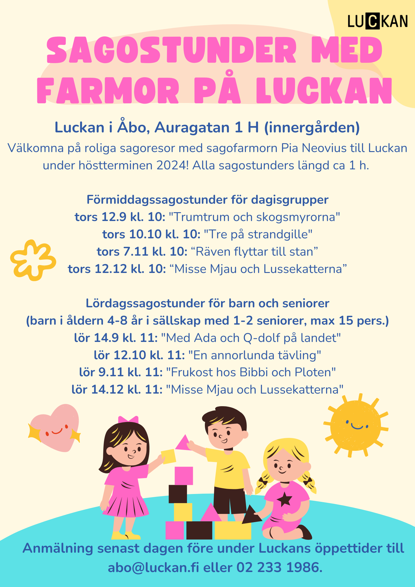Välkomna på roliga sagoresor med sagofarmorn Pia Neovius till Luckan under höstterminen 2024! Alla sagostunders längd ca 1 h.
